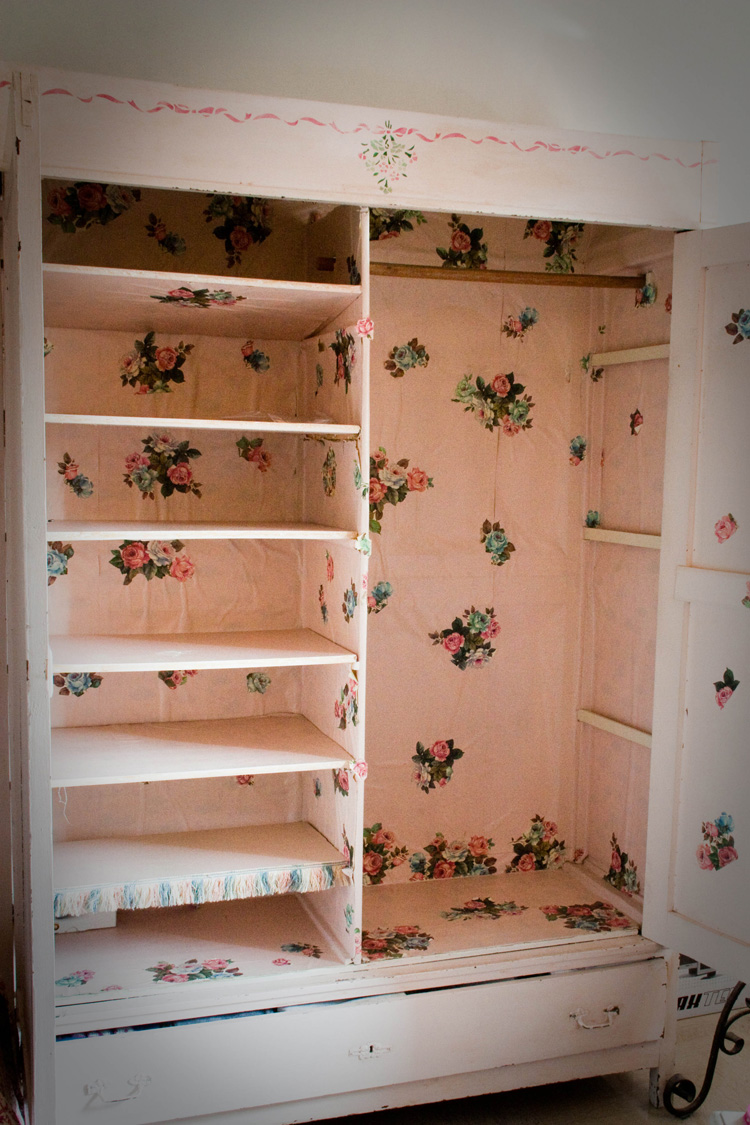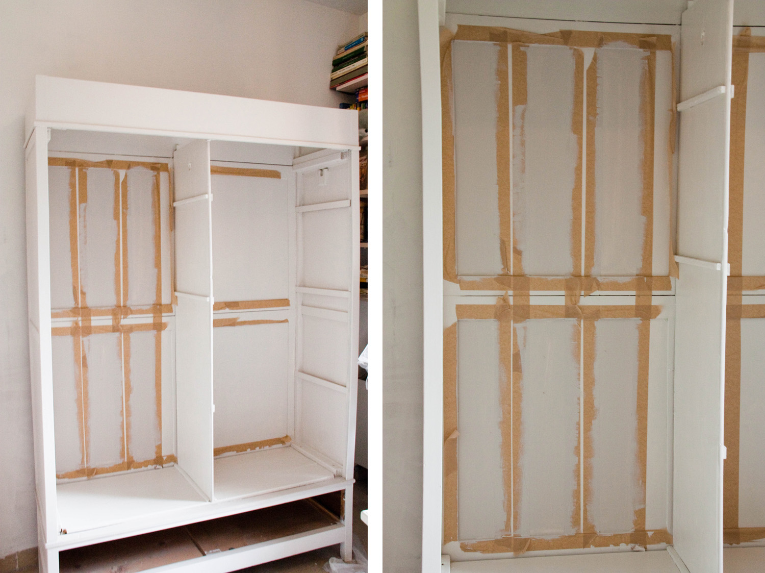 First of all the owner ( with the help of her fantastic assistant!) took off the wall paper that cover the inside of the wardrobe, then the old paint ( I know it was the hard part! They used some chemical product that smell terribly) , sand the wardrobe entirely and started with the prime base.