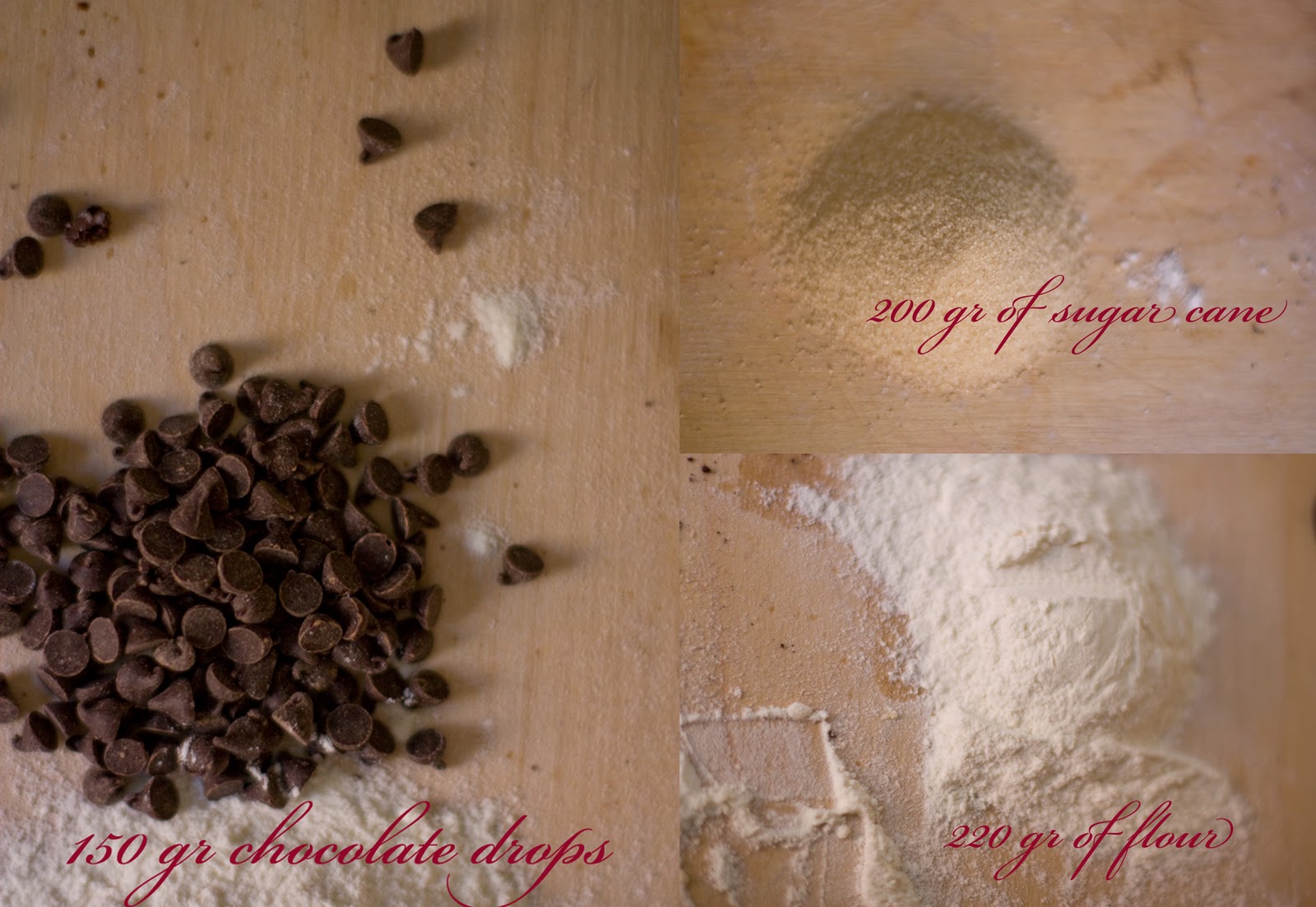 Flour, chocolate drops, sugar cane, baking powder, baking soda and salt.