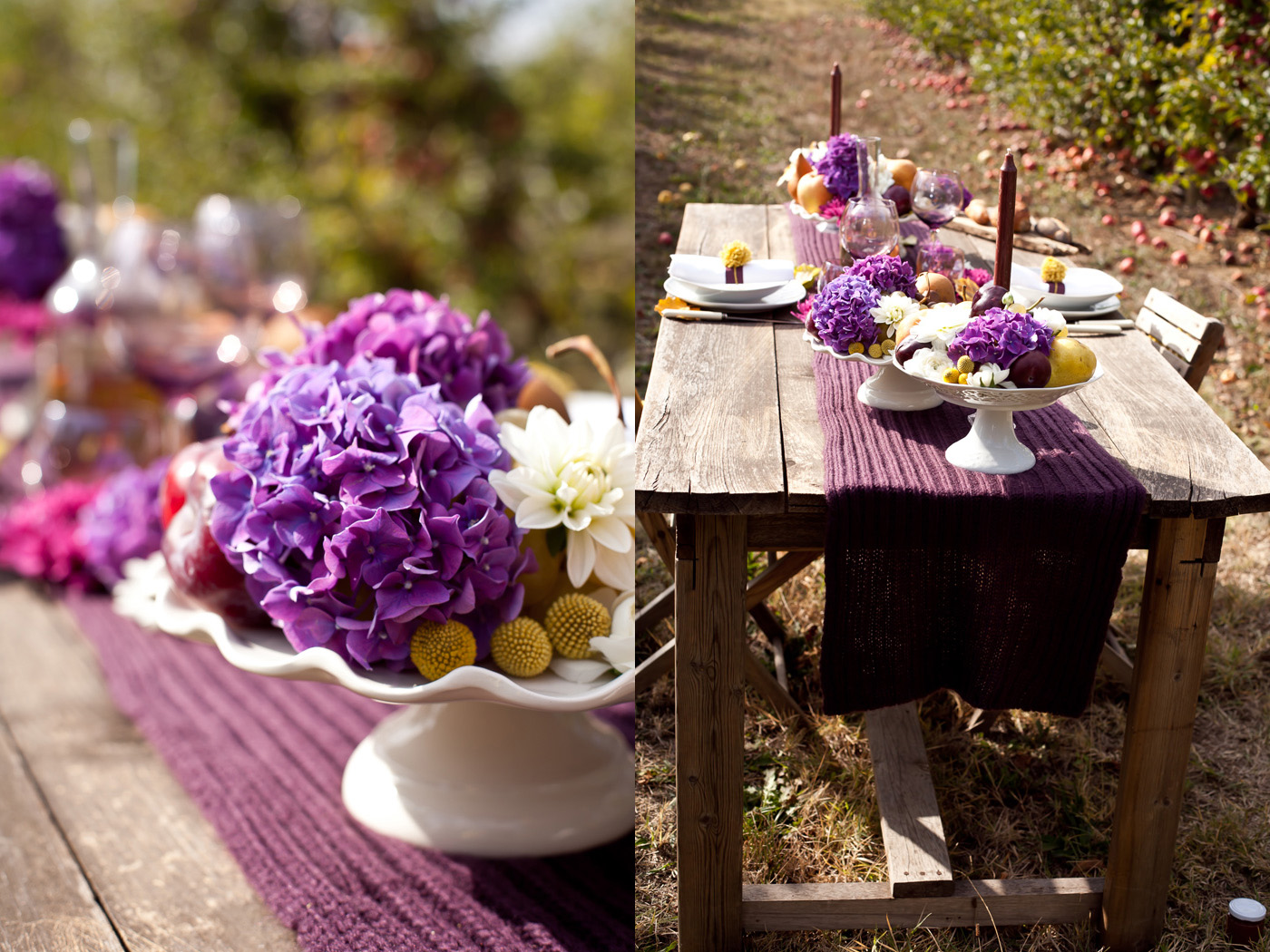 We wanted to create a cozy and romantic lunch wedding for two, with fruit and cheese as the main courses, and we wanted to use colors that were unexpected, in an autumn palette that went beyond the usual red-orange combo. So we chose a warm mustard yellow and a deep plum purple. Something different from the pastel palettes we are more used to!