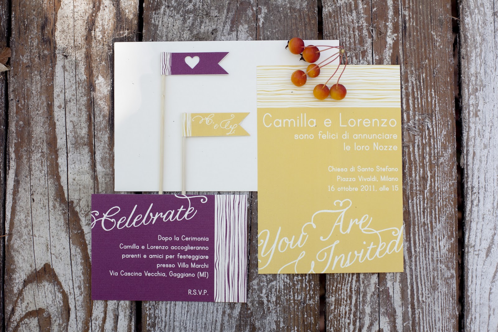 Abbiamo voluto ricreare un romantico e caldo pranzo di matrimonio per due, a base di frutta e formaggi, e volevamo usare dei colori non scontati e una palette autunnale un po’ alternativa al solito rosso e arancio. Abbiamo quindi scelto una tonalità di giallo tendente al mostarda e un prugna intenso. Qualcosa di alternativo anche alle tonalità pastello a cui siamo più abituate!