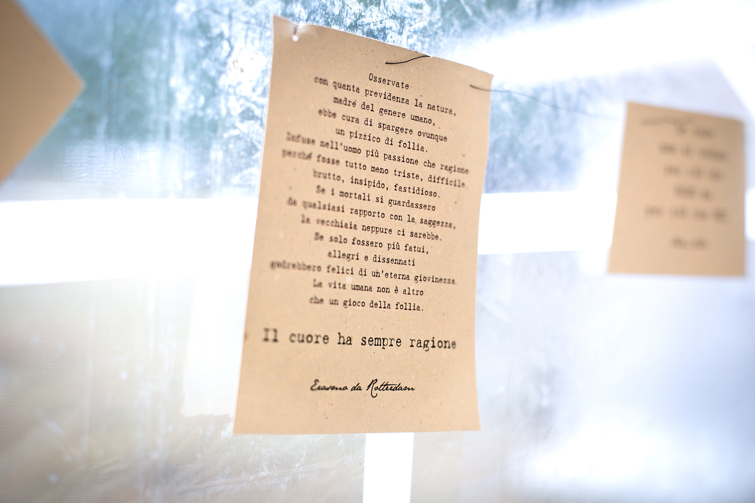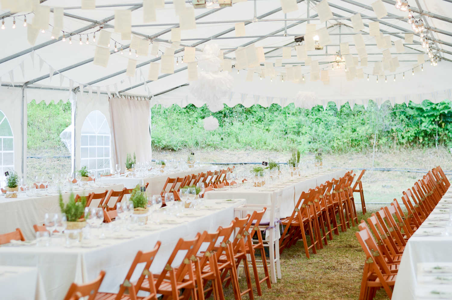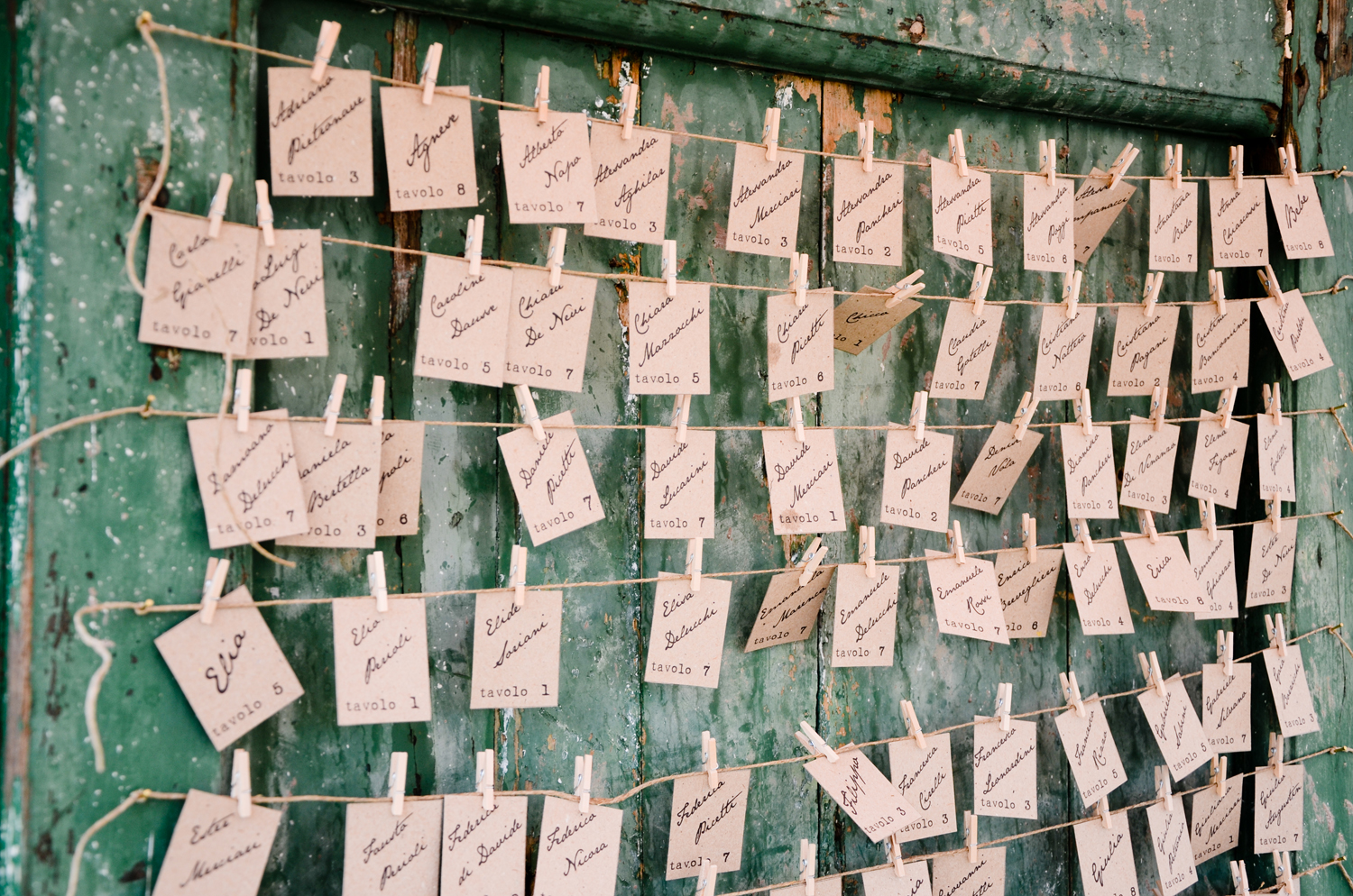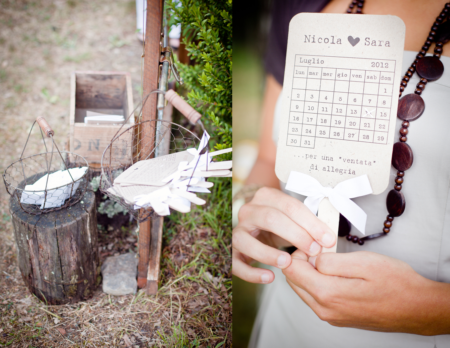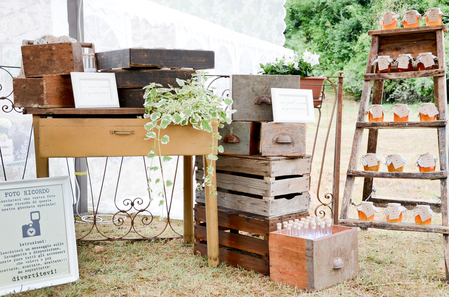Sara si è occupata di tutto ha fatto gli inviti, i ventagli, il libretto della chiesa, i tag, i pompon e le bandierine, ha usato pagine di vecchi libri che ha appeso all’interno della tenso struttura, ha attaccato tutti i tag con i nomi degli invitati ad una vecchia porta. Sui tavoli piante di rosmarino. Insieme hanno scelto le bomboniere, bottigliette di grappa o miele d’acacia, da lasciare in ricordo della loro giornata a tutti gli amici che sono arrivati anche dall’estero per stare con loro. Le bomboniere erano sistemate dentro vecchi cassetti che Sara ha recuperato proprio per il suo matrimonio. Ha creato l’angolo del photo boot che hanno apprezzato soprattutto i bambini che si sono divertiti tutta sera a mascherarsi.