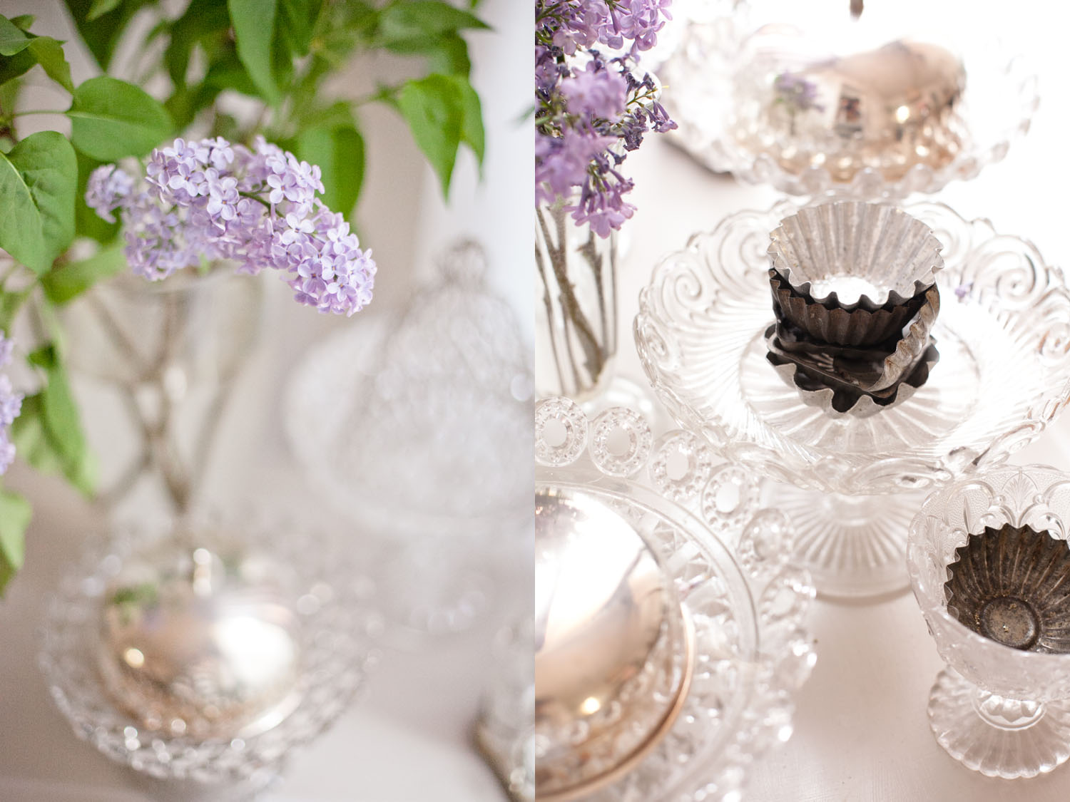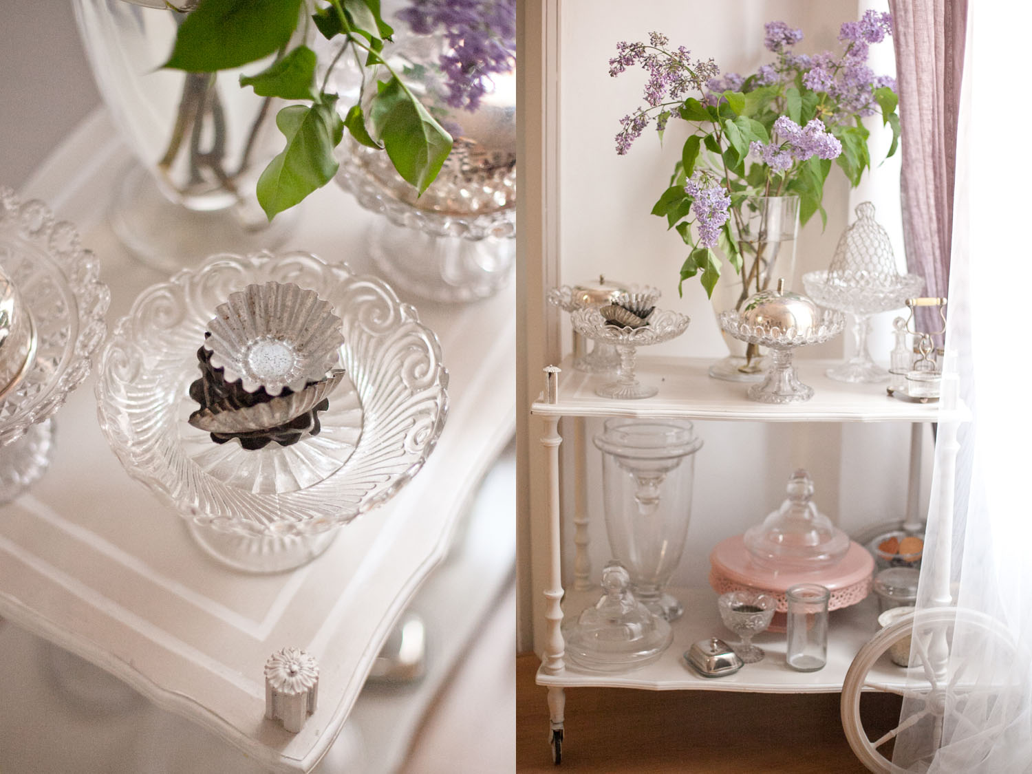 Vasi di zinco, annaffiatoi, acquistati negli anni, sono sistemati sopra alla armadio con dentro fiori, piante e candele. Poi ci sono tutti i dettagli. Le mie alzatine di vetro, vasetti, portacandele, i cuscini fatti con vecchi strofinacci, tende di tulle e lino color melanzana.