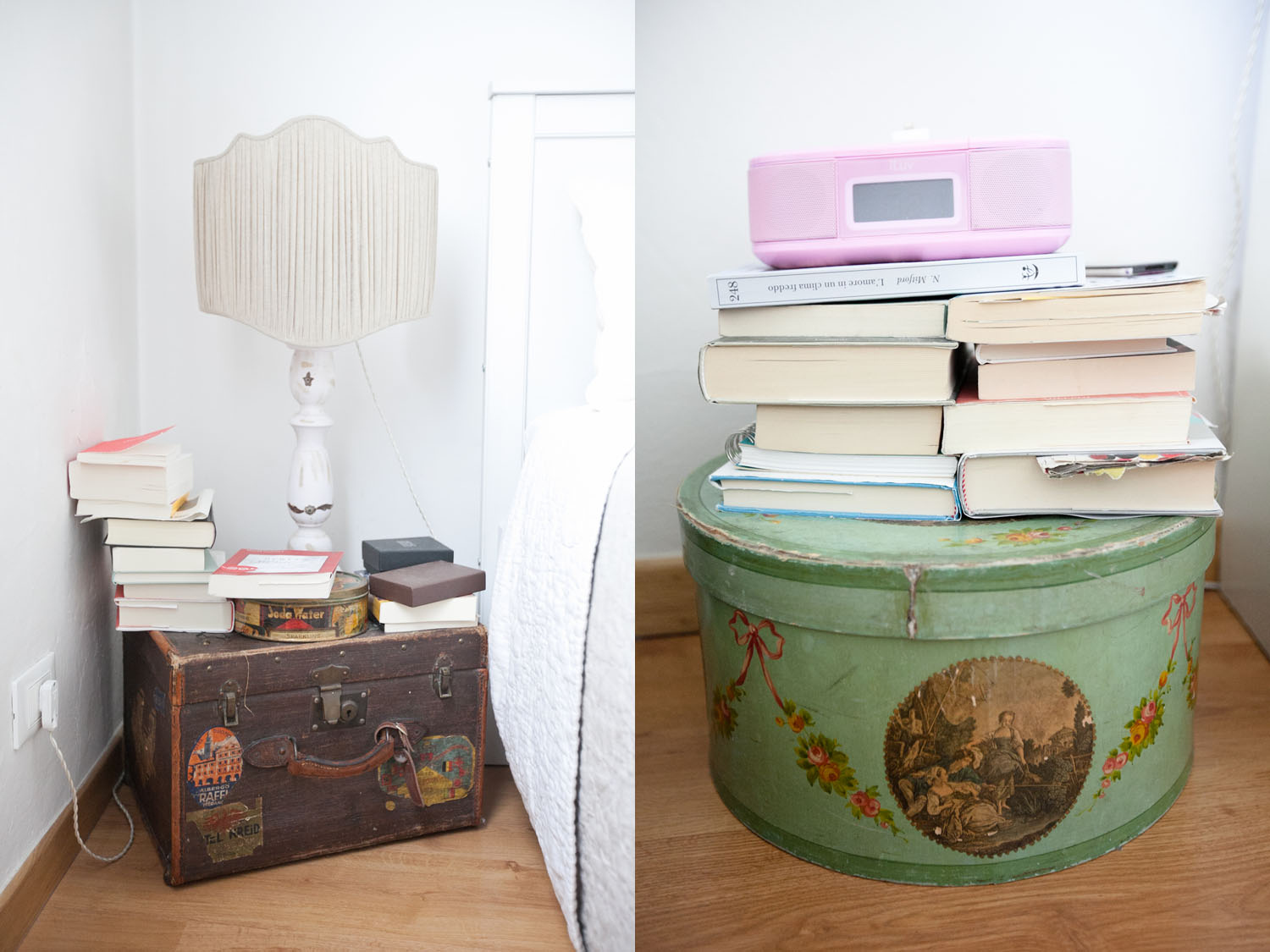 E’ silenziosa e molto luminosa. Per lei abbiamo mantenuto gli stessi colori del resto della casa e, tranne il guardaroba ed il letto Ikea, abbiamo preferito riciclare mobili ed accessori. Un piccolo cassettone per la biancheria, una valigia ed una cappelliera come comodini, due candelabri bianchi in legno che abbiamo fatto elettrificare ai quali abbiamo adattato due ventole in lino fatte a mano, delle vecchie valigie utilizzate per il cambio di stagione volutamente posizionate sopra all’armadio.