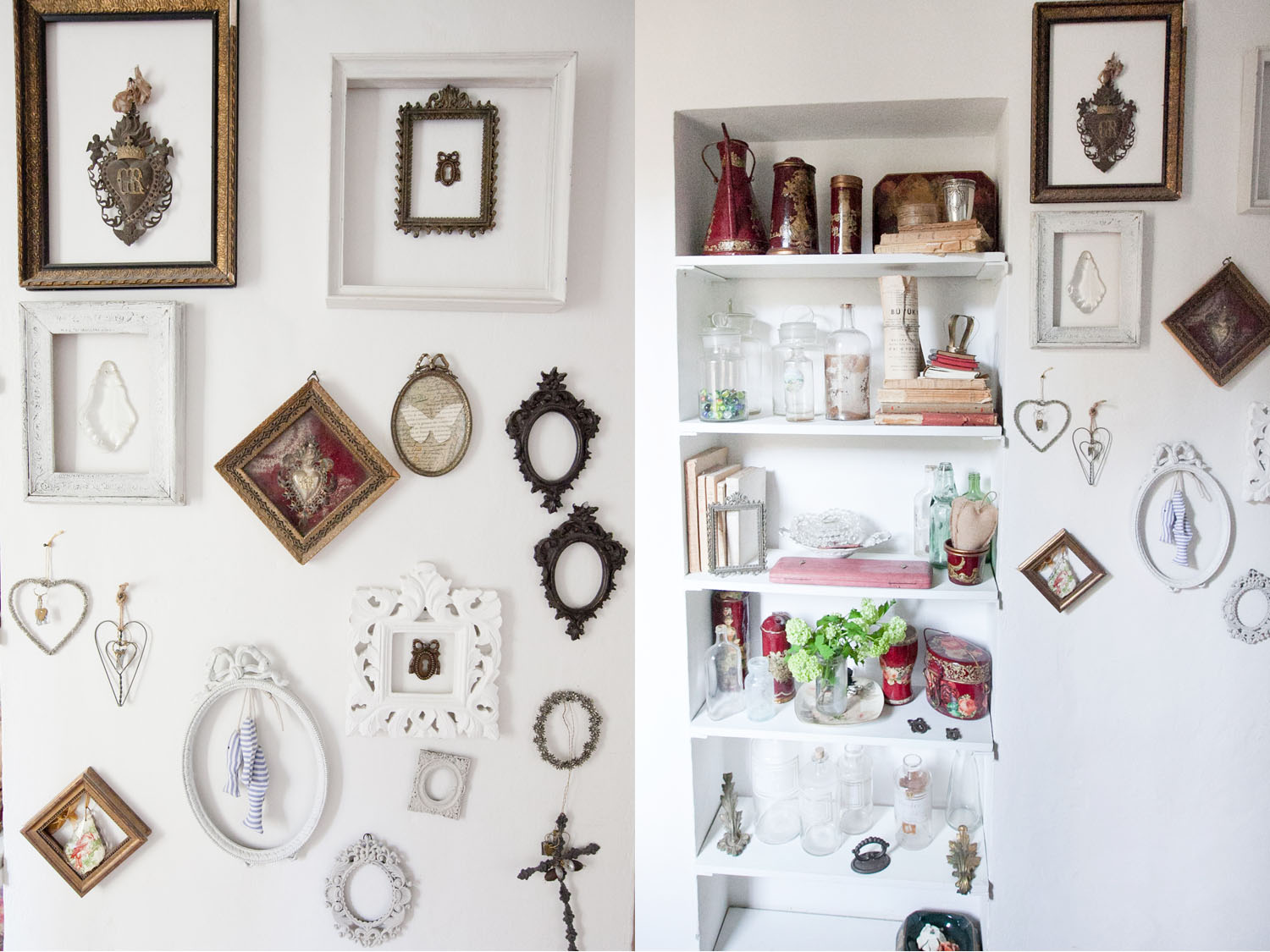 La nicchia ricavata nel muro, con le mensole e tutti gli oggetti raccolti qua e la ed il muro con le cornici vuote sono due dei miei angolini preferiti della casa.